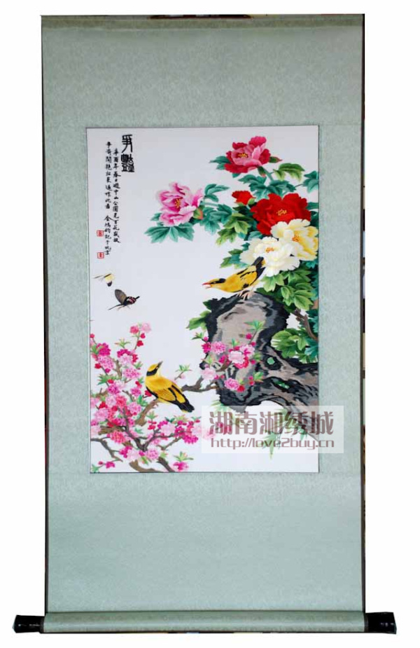 彩蝶飞舞,鸟儿歌唱,百花盛开,春意正浓。此款湘绣卷轴作品,牡丹与桃花一齐盛开,牡丹以它特有的富丽、华贵和丰茂,被视为繁荣昌盛、幸福和平的象征。作品图案为纯手工刺绣,主要以湘绣传统针法掺针、游针、齐边针、分筋针、虚针等针法绣制而成。采用卷轴的装裱形式,高贵典雅,便于携带,是赠送国外友人,企事业单位采购礼品,旅游纪念礼品,商务礼品、居家装饰品的最佳选择之一。