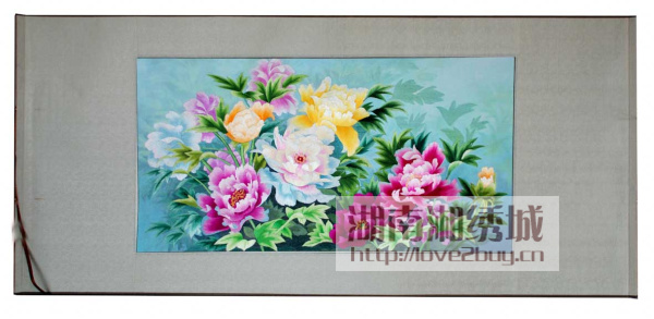 此款湘绣卷轴作品,构图新颖,虚实结合,富有层次感。牡丹以它特有的富丽、华贵和丰茂,被视为繁荣昌盛、幸福和平的象征。作品图案为纯手工刺绣,主要以湘绣传统针法掺针、游针、齐边针、分筋针、虚针等针法绣制而成。采用卷轴的装裱形式,高贵典雅,便于携带,是赠送国外友人,企事业单位采购礼品,旅游纪念礼品,商务礼品、居家装饰品的最佳选择之一。