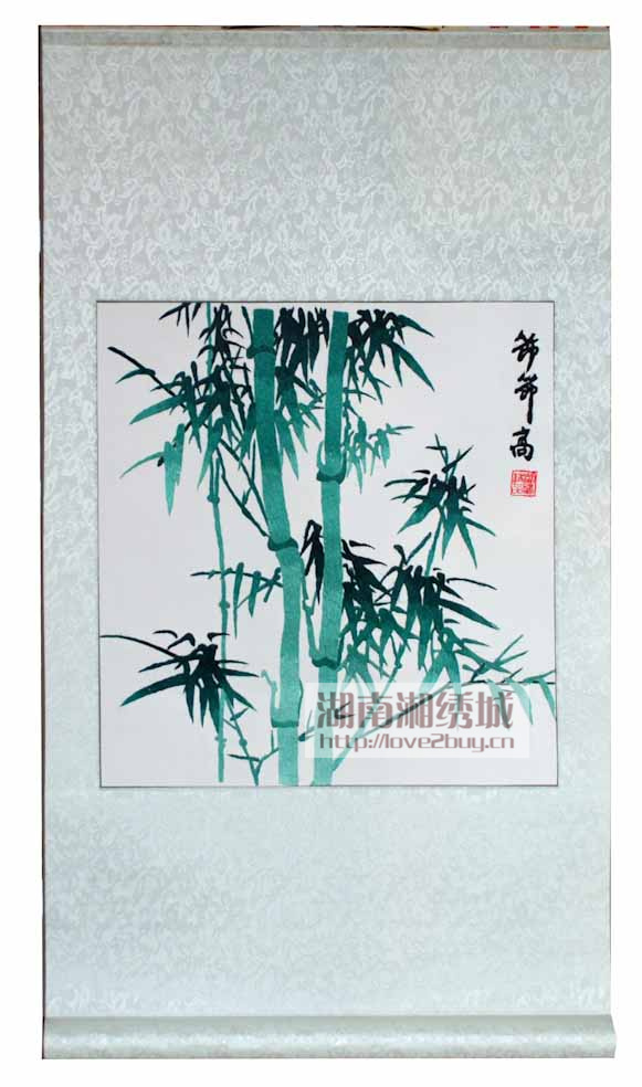 “竹子节节高”的说法象征人生事业发展顺利,一步比一步高。竹子四季青翠、潇洒自若,古人有“玉可碎而不改其白,竹可焚而不毁其节”之说,比喻人的气节,象征“正直虚心”“虚心向上”的精神,被誉为植物“四君子”之一,还被誉为“岁寒三友”之一,是纯洁、友爱、正直、有气节的君子之风的代表。作品图案为纯手工刺绣,主要采用了湘绣73钟针法中的直针、惨针、游针、其边针等多钟针法绣制而成,画面古典大方,绣工精致。作品采用卷轴的装裱形式便于携带,是商务送礼的不二之选,也是装饰书房、办公场所的最佳选择之一。