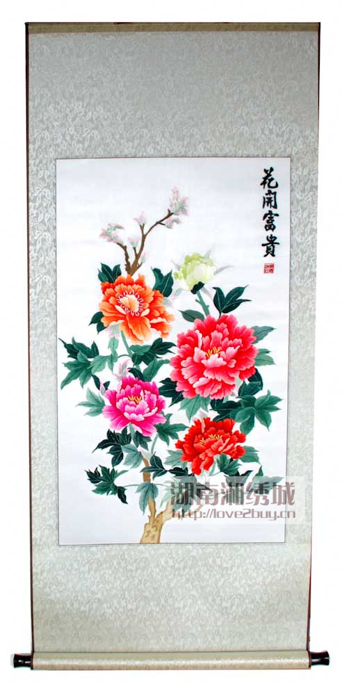 此款湘绣卷轴作品——《花开富贵》,构图饱满、用色丰富,整幅画面艳而不俗、大气十足,是居家送礼的最佳选择。此款湘绣作品采用卷轴软表形式,便于携带,无不透露出中国风的古色古香。