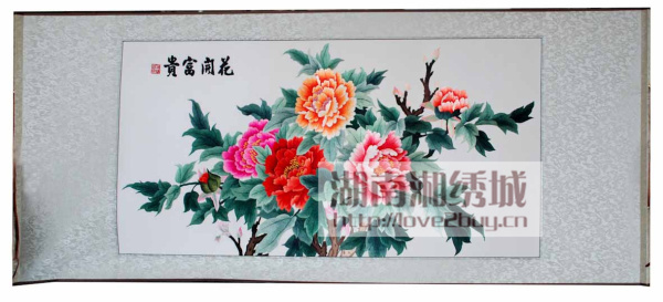 原画为中国画中的工笔花卉,画面牡丹盛开,姹紫嫣红、生机怏然。作品图案为纯手工刺绣,主要以湘绣传统针法掺针、游针、齐边针、分筋针等针法绣成。国色天香的牡丹不仅美丽动人,更有富贵吉祥的寓意。用湘绣将此画绣出,为画为绣,堪称一绝。作品采用卷轴的装裱形式,便于携带,是赠送国外友人,企事业单位采购礼品,旅游纪念礼品,商务礼品的最佳选择之一。
