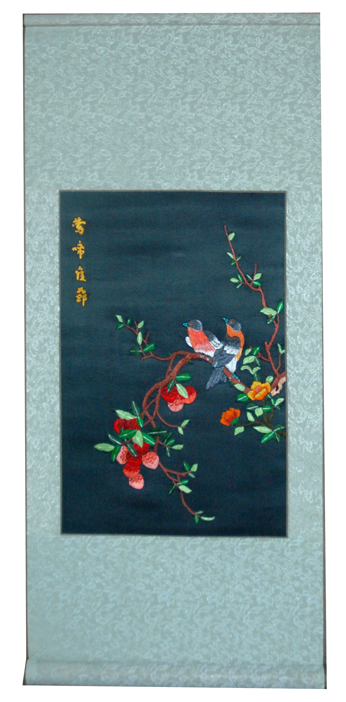 此款湘绣卷轴作品,构图清晰,色彩丰富,鸟儿飞上枝头,动静结合,一派生机盎然。作品以黑色真丝缎料为底料,图案为纯手工刺绣,主要以掺针、毛针、刻麟针、直针、齐边针等针法绣制而成。采用卷轴的装裱形式,高贵典雅,便于携带,是赠送国外友人,企事业单位采购礼品,旅游纪